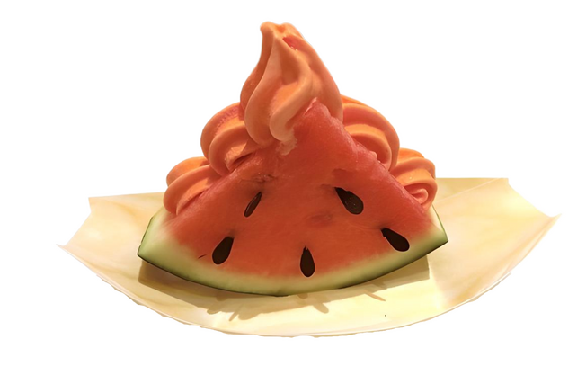 This juicy treat consists of watermelon sorbet inside a wedge of watermelon complete with chocolate watermelon seeds.