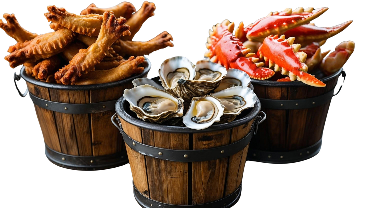 Fill your bucket with one of the following: Fried Frog Legs, Oysters (Charbroiled, Fried, or Raw), or Boiled Crab Claws.