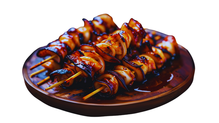 Enjoy these succulent, barbequed squid skewers, smothered with a savory glaze.