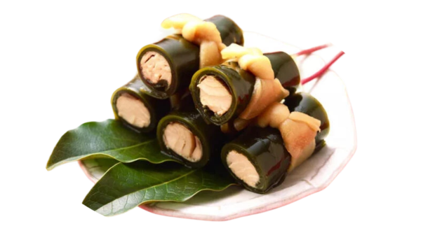 Stuffed with salmon and tied with a beautiful strip of kanpyo (dried gourd) and simmered in soy sauce, mirin, sake, and sugar, these kelp rolls brings out the natural subtle and savory flavors of Umami.